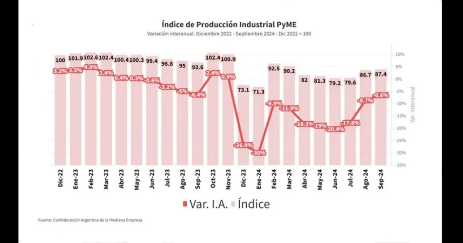 La actividad manufacturera de las pymes descendió 6,6% interanual en septiembre y acumula una retracción de 15,1% en los primeros nueve meses del año frente al mismo período de 2023. Es la menor tasa de caída en 10 meses y en la comparación intermensual desestacionalizada se verifica un incremento del 3,7%.