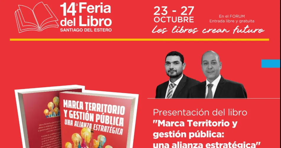 El próximo jueves 24 de octubre de 2024, a las 18, se realizará la presentación exclusiva del libro "Marca Territorio y gestión pública: una alianza estratégica", de Mariano Escobar y Cristian Baquero Lazcano, en la Sala 2 José Andrés Rivas del Fórum, ubicado en la ciudad de Santiago del Estero. Esta actividad se enmarca dentro de la 14ª Feria del Libro de Santiago del Estero, uno de los eventos culturales más importantes del norte argentino. La presentación, a cargo de los propios autores, está destinada a un público interesado en el desarrollo territorial, el marketing de ciudades y la gestión pública.