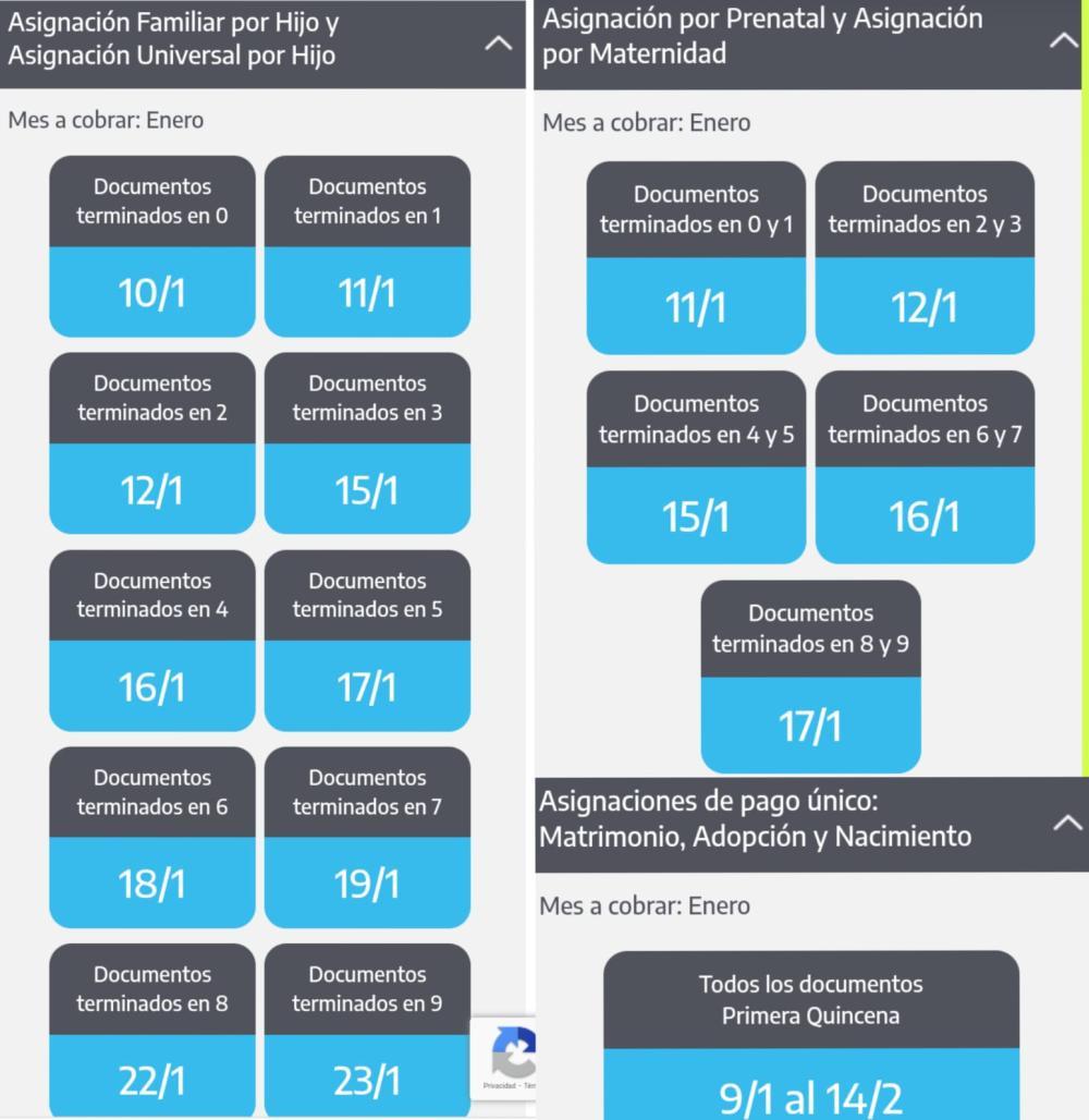 En el caso de las Asignaciones Pago Único: todas las terminaciones de documentos (primera quincena) cobrarán del 9 de enero al 14 de febrero; y segunda quincena del 22 de enero al 14 de febrero.