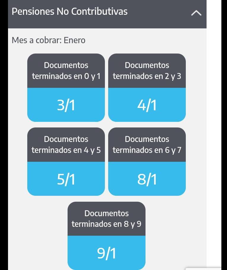 En cuanto a los Fondos de Desempleo será de la siguiente manera: DNI terminados en 0 y 1, el martes 23 de enero; DNI terminados en 2 y 3, el miércoles 24; DNI terminados en 4 y 5, el jueves 25; DNI terminados en 6 y 7, el 26; y DNI terminados en 8 y 9, el lunes 29.