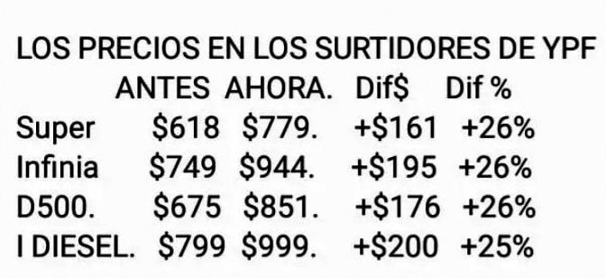 La suba promedio aplicada por YPF fue de un 26%, lo que llevó el litro de Super a $161 más por litro. En el caso de la Infinia, fue de $195 más por litro. En el gasoil, el D500 aumentó en $176 más por litro y en el Infinia, $200 más por litro.