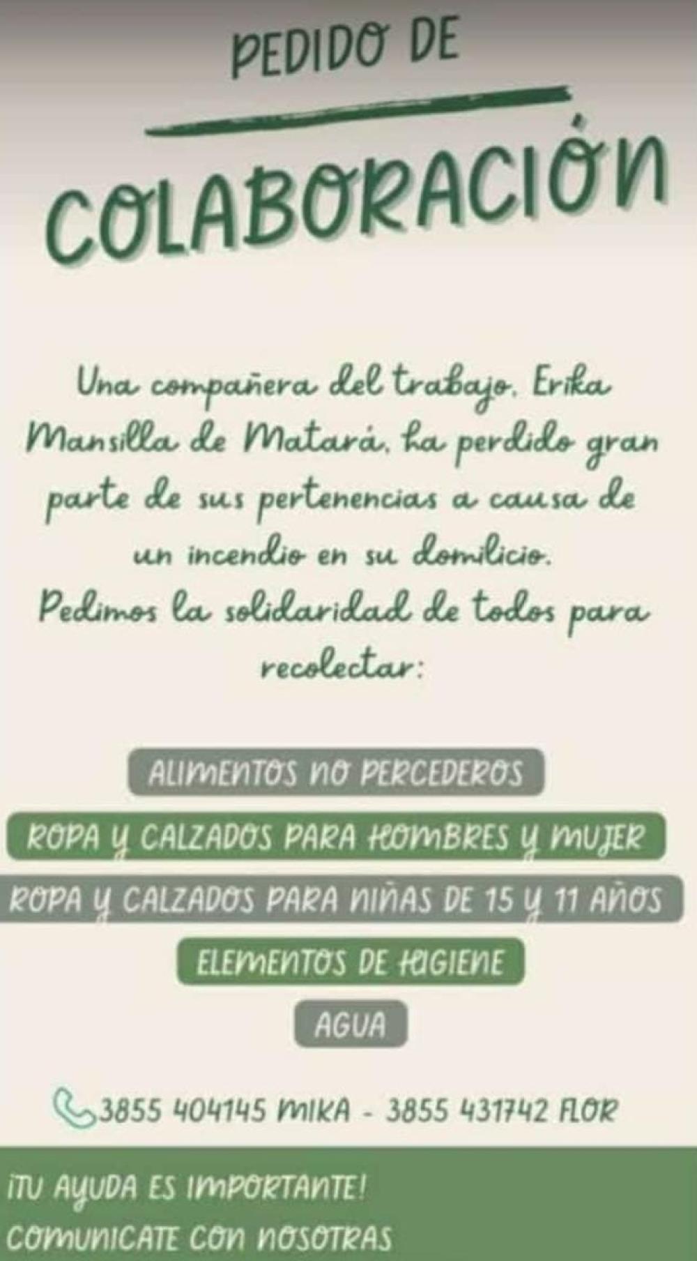 Ante este lamentable panorama, amigos y allegados de Mansilla iniciaron una campaña solidaria solicitando a la comunidad santiagueña que aporte su granito de arena que ayude a sobrellevar su vida después del incendio de su hogar.