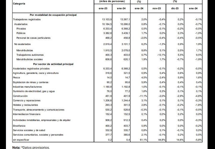 En el mes de enero de 2024 se contabilizan 10,266 millones de personas con empleo asalariado registrado (incluyendo al sector privado, el sector público y el trabajo en casas particulares) y 3,101millones de personas con trabajo independiente (monotributistas y autónomos).