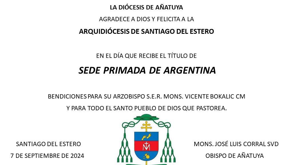 La Diócesis de Añatuya envió hoy un mensaje a su par de Santiago, que hoy pasará a convertirse en nueva Sede Primada.