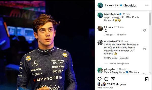El post fue una breve referencia a su participación en el Gran Premio de Las Vegas, el cual se llevará a cabo este fin de semana. "Vegas babyyyyy! ALL IN al 43 este findee", escribió Colapinto en su cuenta de Instagram, con emojis de dados y caritas sonrientes, haciendo alusión a la ciudad de Las Vegas y a su participación en el circuito.
