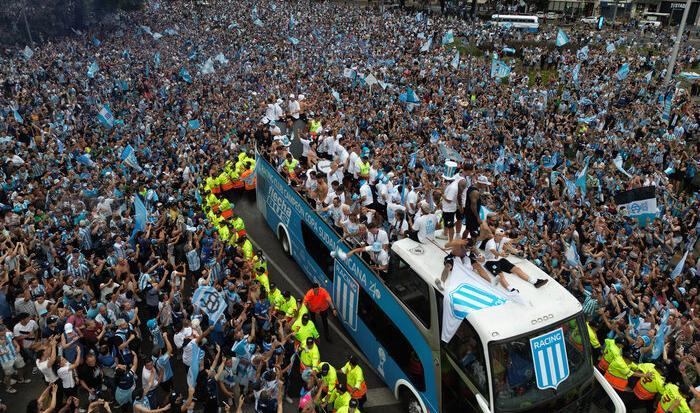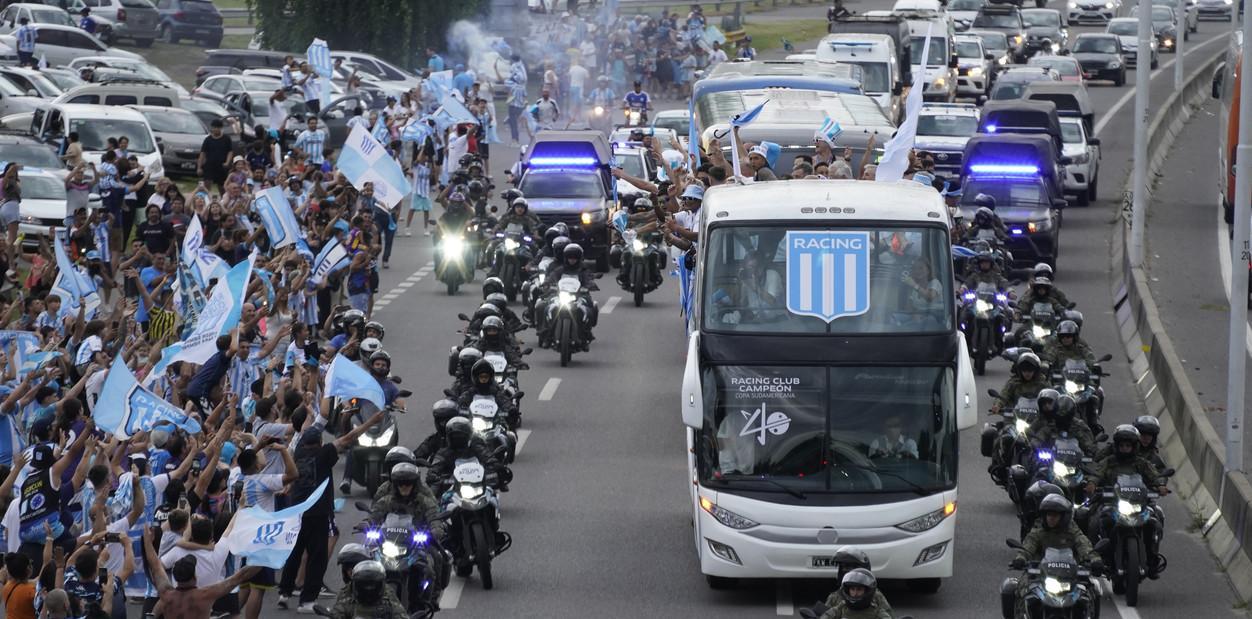 "Racing. Campeón Sudamericana 2024", se leía en decenas de banderas que se agitaban en la calle. Caminando y cantando, se vieron padres con sus hijos pequeños sobre los hombros, amigos vestidos con camiseta de Racing, transpirados, felices, con bebidas frescas para enfrentar el calor. Todo fue válido para festejar.