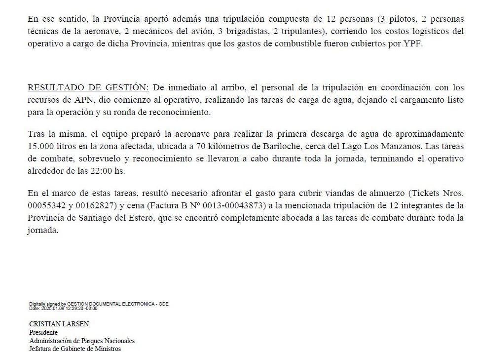 "Claudio, lo que estás mencionando es incorrecto. Te adjunto el informe oficial con la justificación detallada de cada uno de los gastos realizados durante la emergencia en el operativo de combate de incendios en el Parque Nacional Nahuel Huapi. Quedo a disposición para cualquier consulta adicional", manifestó el santiagueño.