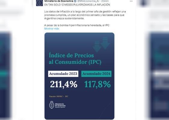 El Ministerio de Economía aseguró que "en solo 12 meses, lograron revertir el escenario hiperinflacionario y sentaron las bases para el crecimiento".
