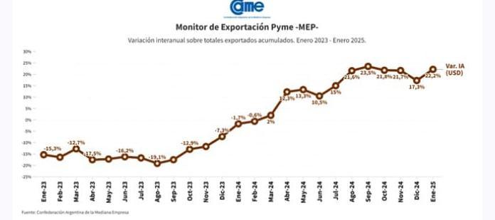 Así surge del Monitor de Exportación Pyme (MEP), un indicador elaborado por el sector de Estadísticas e Informes de la Confederación Argentina de la Mediana Empresa (CAME), para medir las exportaciones de las pequeñas y medianas empresas de la República Argentina, en base al monitoreo mensual de las operaciones de las empresas argentinas en el comercio exterior, discriminando por su condición pyme declarada ante la Secretaría de la Pequeña y Mediana Empresa, Emprendedores y Economía del Conocimiento, dependiente del Ministerio de Economía de la Nación.