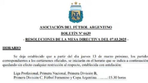 "Se deja establecido que a partir del día jueves 13 de marzo próximo, los partidos correspondientes a los certámenes oficiales, se iniciarán en el horario que se indica a continuación, quedando sin efecto cualquier restricción al respecto, establecida con antelación: Liga Profesional, Primera Nacional, Primera División B, Primera División C, Fútbol Femenino y Copa Argentina ..: 15.30 horas".