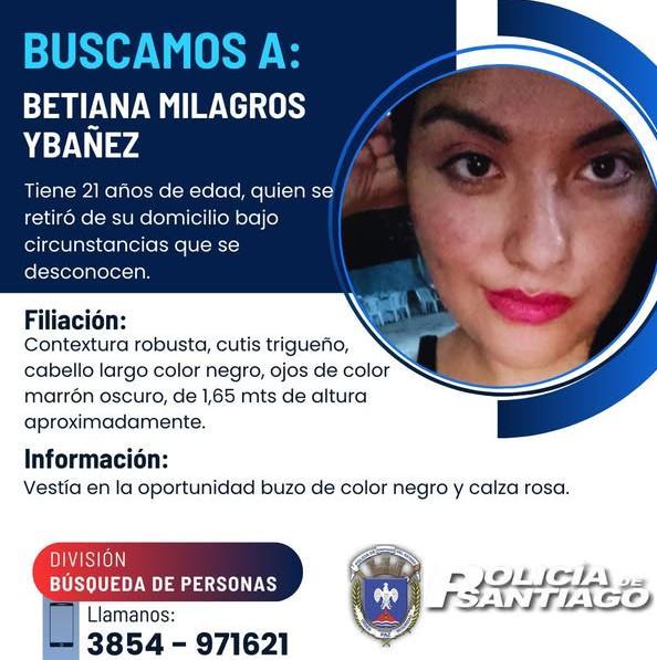 Efectivos policiales de la División Búsqueda de Personas y la Comisaría Comunitaria Nº 14 están abocados a la búsqueda de la joven Betiana Milagros Ybañez, de 21 años, quien se retiró de su domicilio bajo circunstancias que se desconocen.