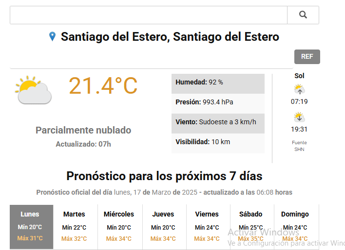 El Servicio Meteorológico Nacional informa que Santiago del Estero inicia su semana con una máxima de 31° y se espera cielo parcialmente nublado toda la jornada. Eso sí, la humedad se hará sentir con fuerza: a las 7 de la mañana, superaba el 90%.