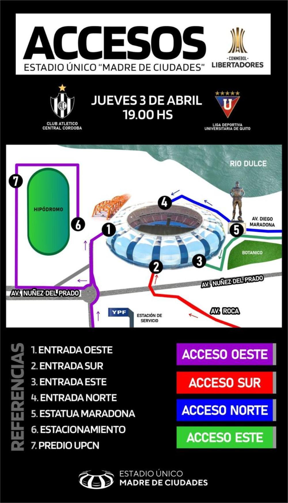 Este jueves 3 de abril, a las 19:00 horas, Central Córdoba enfrentará a Liga Deportiva Universitaria de Quito en el Estadio Único Madre de Ciudades, por la fase de grupos de la Copa CONMEBOL Libertadores. Para garantizar un ingreso ordenado, se establecieron accesos diferenciados según la ubicación dentro del estadio. Las puertas del estadio se abrirán a las 15:30.