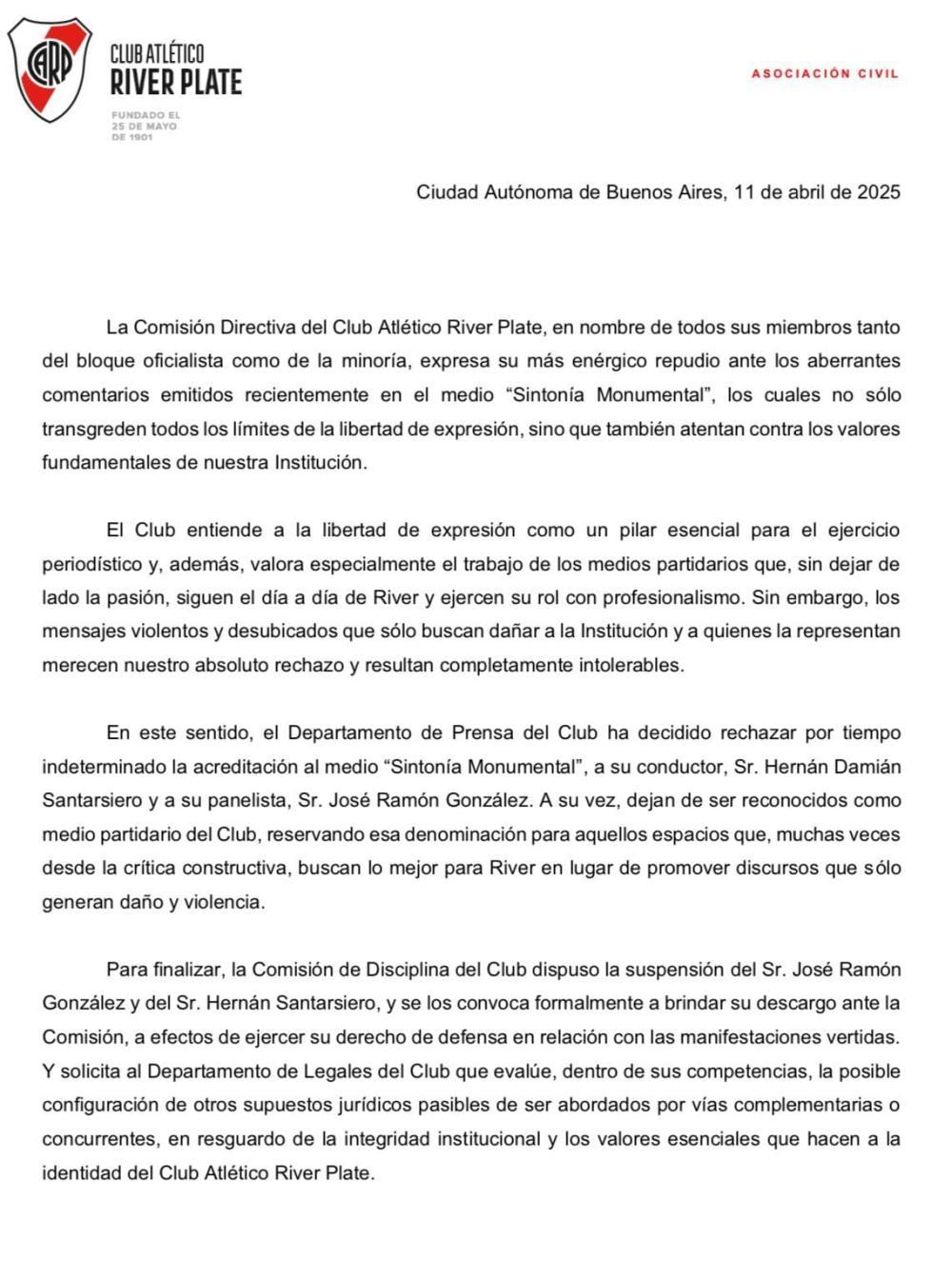 Un hecho repudiable tuvo lugar en el programa "Sintonía Monumental", conducido por Hernán "Tano" Santarsiero, que generó un fuerte rechazo en el mundo River. El conductor se refirió a Marcelo Gallardo como una "persona enferma", lo que motivó a una respuesta contundente por parte del Club Atlético River Plate.