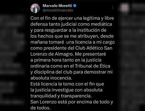 Así lo anunció el propio Moretti este martes por la noche en redes sociales, en un comunicado en el que dijo alejarse del "Ciclón" para que "la justicia investigue con absoluta tranquilidad y transparencia".
