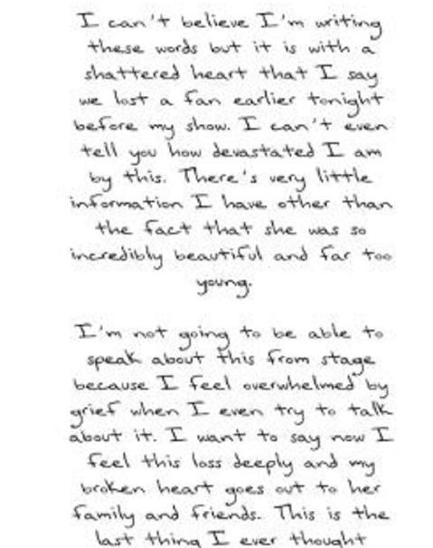 "No puedo creer que esté escribiendo estas palabras, pero es con el corazón destrozado que digo que perdimos a una fan esta noche antes de mi show. No les puedo explicar lo devastada que estoy tras esto. Tengo muy poca información aparte del hecho de que era increíblemente hermosa y demasiado joven", escribió en su historia.