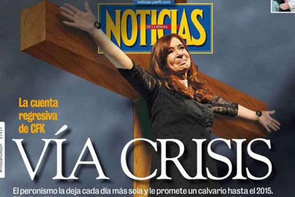 Se trata de la revista “Noticias”, que en su edición de este mes y bajo el título “Vía Crisis” exhibe en su portada la imagen de la Presidenta en la cruz con la leyenda “cuenta regresiva”, lo que generó fuertes críticas de diferentes sectores, entre ellos del arzobispo de Buenos Aires, cardenal Mario Poli, quien la calificó “de muy mal gusto”.