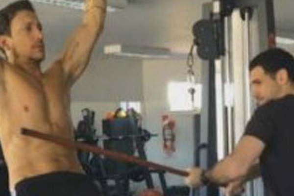 El actor publicó un video en el que se lo ve en el gimnasio haciendo abdominales colgado de una baranda y su entrenador le pega en el abdomen con un palo.