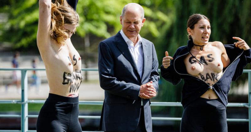 Dos activistas se desnudaron de la cintura para arriba, donde se habían escrito "embargo al gas ya", para ser fotografiadas junto al canciller alemán Olaf Scholz como forma de protesta por la compra de Berlín al gas ruso en el marco de la guerra con Ucrania. Las dos mujeres sorprendieron al jefe del gobierno alemán cuando se le acercaron con el pretexto de sacarse una fotografía.