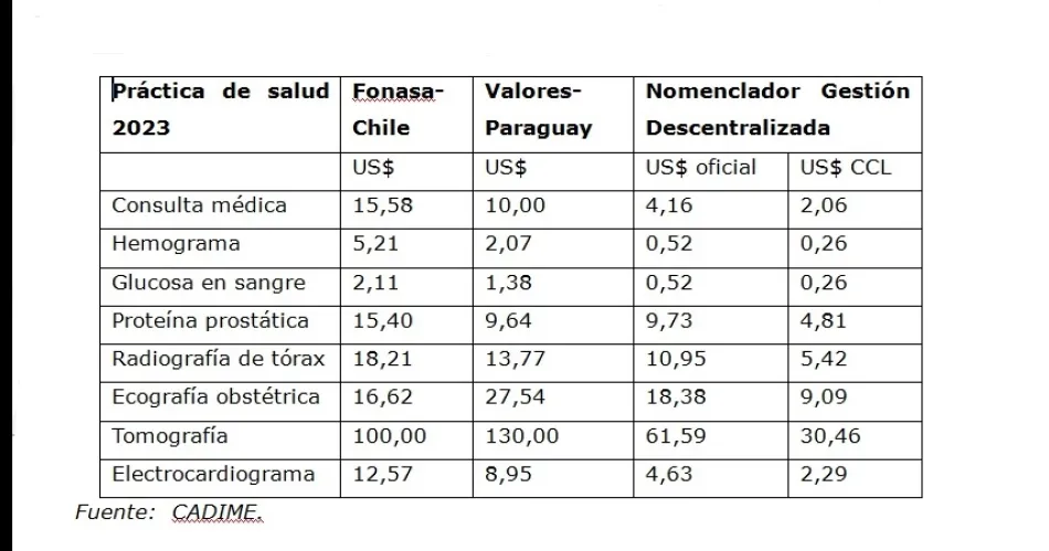 En los casos de análisis de glucosa en sangre o hemograma, el arancel de referencia es de U$S 0,52 oficiales y U$S 0,26 CCL. En tanto, en Chile se pagan U$S 2,11 (+711% con relación al valor al dólar CCL) y U$S 5,21 (+1.904%) dólares, respectivamente, y en Paraguay U$S 1,38 (+430%) y U$S 2,07 (+696%)". Según Gómez Galizia, "este fuerte atraso arancelario, pone en situación límite las actividades de los prestadores ambulatorios".