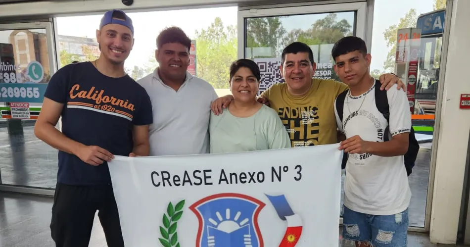 La docente Daniela Farías junto al Operador Socio Terapéutico Emmanuel Catan y los alumnos Luciano Campoya e Ignacio Ponce partieron junto a la delegación de estudiantes de la provincia para sumarse al evento.