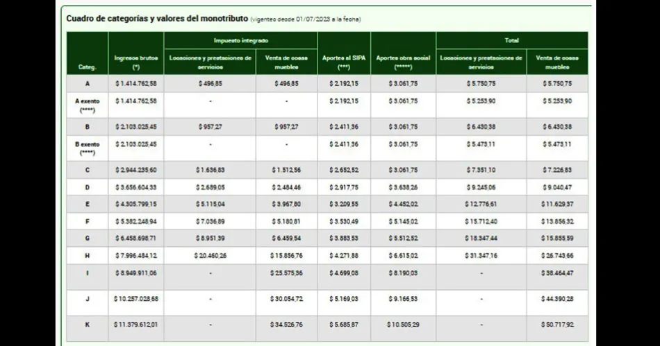 La suma de los ingresos brutos obtenidos de las actividades incluidas en el presente régimen, en los últimos 12 meses inmediatos anteriores a la obtención de cada nuevo ingreso bruto incluido este último exceda el límite máximo establecido para la categoría H ($ 7.996.484,12) o para la categoría K ($ 11.379.612,01), según si realiza locaciones y prestaciones de servicios o venta de cosas muebles.