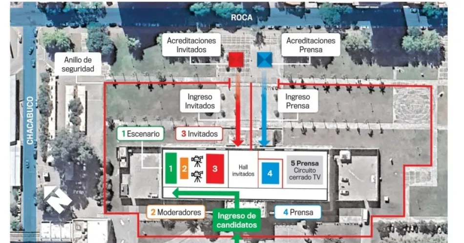 También habrá un sector específico para que estilistas santiagueñas peinen y maquillen a los postulantes a la Presidencia y a los periodistas que serán moderadores. El domingo, a partir de las 17 podrán ingresar los medios y periodistas acreditados; y los invitados lo harán desde las 18, ambos por calle Roca (ver Infografía). Habrá ingresos distintos para periodistas y los invitados que podrán acceder al sector donde se realizará el debate.
