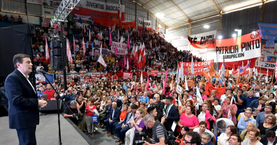 Y expresó: "Yo quiero enviar desde este encuentro con banderas rojas y blancas del radicalismo de Santiago del Estero, un mensaje a todos los hombres y mujeres, desde este estadio, que lo respetan a don Raúl y que lo respetan como 'Padre de la Democracia', que el 19 de noviembre pongamos todos sus valores en las urnas, porque queridos correligionarios, la grieta en la Argentina se terminó si el 19 de noviembre, el voto es amor, esperanza, y unidad, todos juntos los argentinos, todos juntos los santiagueños".