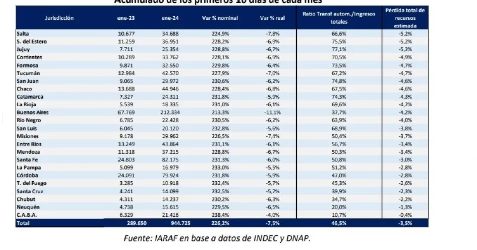 Un informe del Iaraf que dirige el economista Nadín Argañaraz, reveló que el gobierno de Javier Milei redujo las transferencias automáticas a las provincias en un 7,5%, comparando la primera quincena de enero de este año con igual período de 2023.
