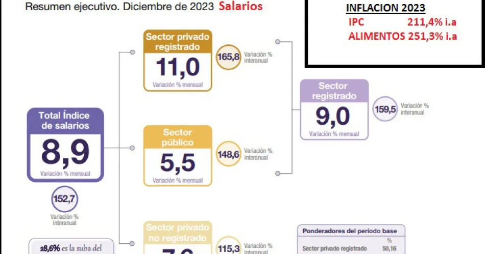 Por José Aranda - Los salarios perdieron por 58,7% contra la inflación a lo largo de todo el año 2023. La inflación alcanzó el 211,4% y el índice general de salarios subió solo 152,7%.