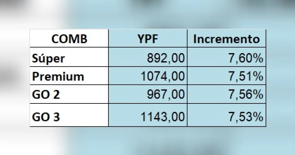 Con los nuevos valores, la nafta Súper aumentó de $829 a $892 (7,6%); la Infinia de $ 999 a $1.074 (7,5%), el gasoil 500 de $ 899 a $ 967 (7,6%) y el gasoil Infinia de $ 1.063 a $ 1.143 (7,5%).
