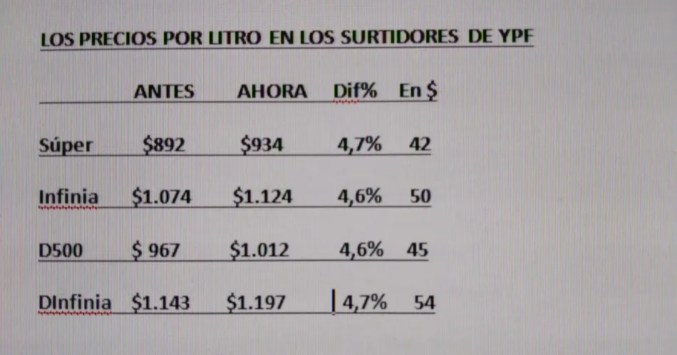 YPF subió el precio de sus combustibles en promedio un 4,6% desde este lunes