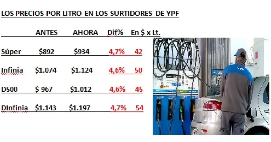 A su vez el Diésel 500 ahora cuesta $1.012 (antes $967) y el Diésel Infinia, $1.197 por litro (antes $1.143).