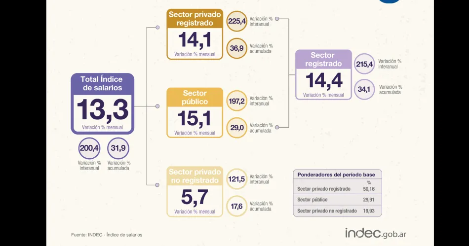 El crecimiento mensual se debe a subas de 14,1% en el sector privado registrado, 15,1% en el sector público y 5,7% en el sector privado no registrado con una fuerte caída.