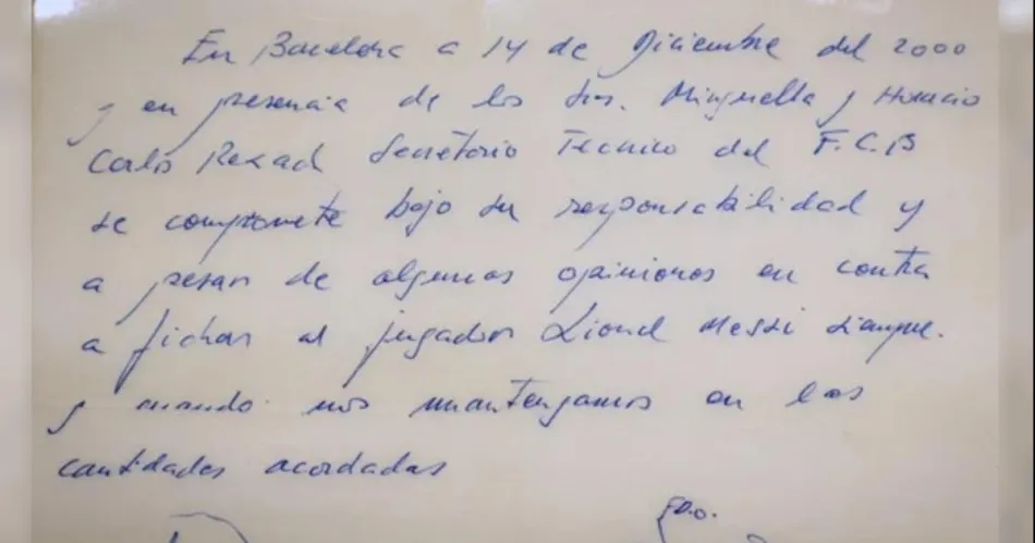 La servilleta fue firmada en diciembre de 2000 por el exdirector deportivo del Barça Carles Rexach y el asesor de fichajes Josep Minguella, junto con Gaggioli, durante un almuerzo en un club de tenis.
