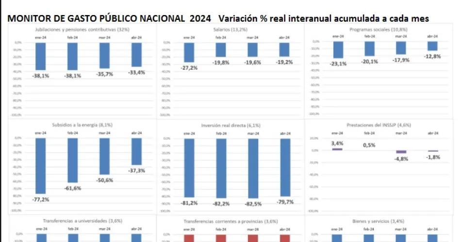 De acuerdo con el Monitor de Gasto Público Nacional elaborado por el Instituto Argentino de Análisis Fiscal (Iaraf) que dirige el economista Nadín Argañaraz, hay gastos que acentuaron la intensidad de su recorte, mientras que otros disminuyeron su intensidad, pero no dejaron de mantener firme el proceso de recorte de asignaciones desde el Estado nacional.