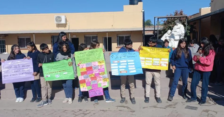 La propuesta tuvo lugar en todos los establecimientos educativos de la provincia y, en esta ciudad, los alumnos del Colegio Sagrada Familia dieron a conocer una serie de mensajes ante las problemáticas de consumo, que afecta principalmente a jóvenes y adolescentes.