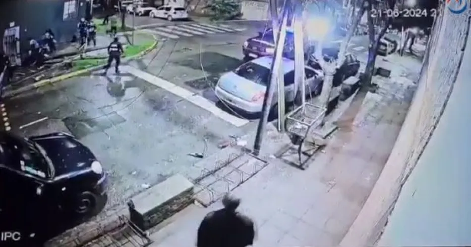 El móvil policial seguía a un vehículo con pedido de captura, perdió el control y arremetió contra esas personas, en una secuencia que quedó filmada por las cámaras de seguridad.