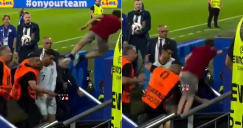 Pero ante el partido ante Georgia, un fanático superó los límites al saltar desde la tribuna cuando el 7 de Portugal se marchaba. No solo eso, el joven casi golpea al futbolista y finalmente termina cayendo por un hueco en las escaleras.