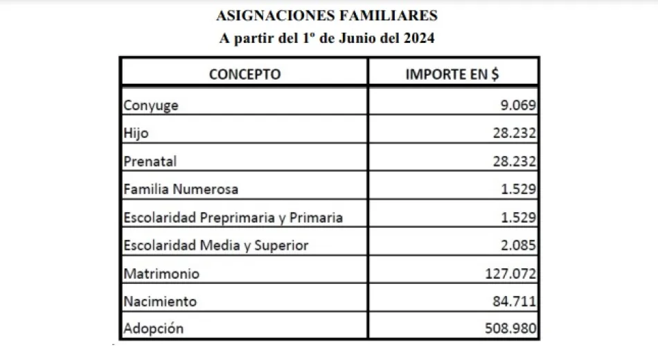 De acuerdo con los nuevos montos que corresponden a las asignaciones, según el caso las mismas fueron fijadas de la siguiente manera: Cónyuge, $9.069. A su vez, la asignación por Matrimonio, asciende a $127.072 y en el caso de la Adopción de un hijo/a el monto es de $508.980.