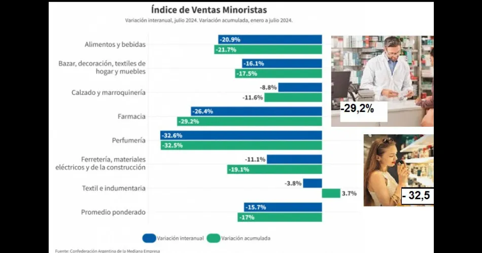 Perfumería: El descenso fue del 32,6% anual, a precios constantes, y acumulan una caída de 32,5% en los primeros 7 meses del año frente al mismo periodo de 2023. En la medición intermensual, la merma fue de 2,4%. El sector se vio prácticamente paralizado en julio, con poca gente consultando.
