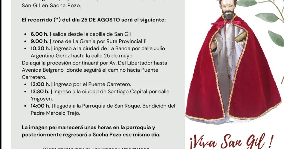 La 114.ª Procesión de San Gil se llevará a cabo el domingo 25 de agosto, partiendo desde Sacha Pozo hacia Santiago Capital, bajo el lema "San Gil, protege nuestra tierra y nuestra gente".