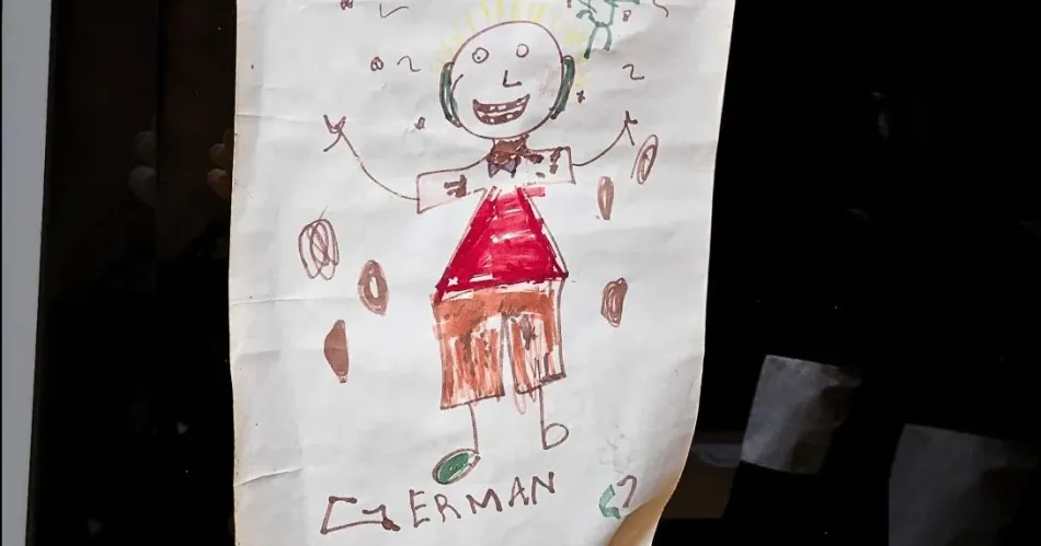 El dibujo representa a un sujeto sin pelo, con una remera roja y blanca, unos pantalones marrones y, pareciera, haciendo malabares, es como dibujó el menor -se desconoce su identidad- a "Germán", tal como plasmó al pie de la hoja en su obra el autor.