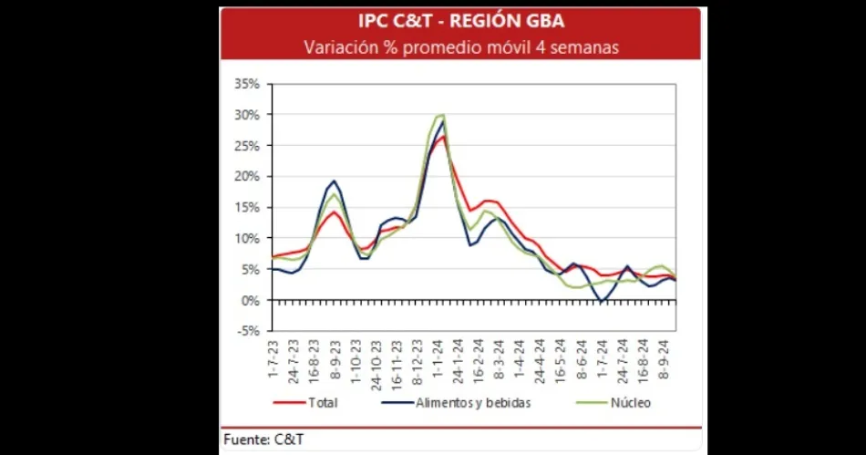 El relevamiento de precios minoristas de C&T para la región GBA presentó un alza de 3,5% mensual en septiembre. Se trata de la menor tasa desde noviembre de 2021. A su vez, la variación de doce meses bajó a 216%.