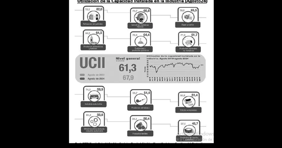 La utilización de la capacidad instalada de la industria alcanzó en agosto al 61,3 %, por debajo del 67,9 % de igual mes del año pasado, informó el Indec.