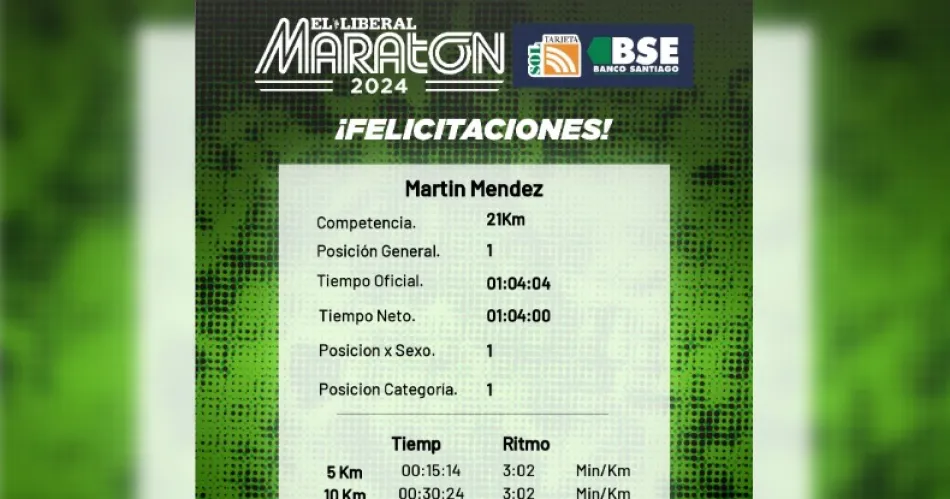 Los corredores que participaron en la 65ª edición del Maratón Aniversario del Diario EL LIBERAL ahora tienen la oportunidad de acceder a sus resultados y obtener un certificado de participación. Este año, el evento no solo celebró el deporte, sino que también ofrece a los atletas la posibilidad de compartir su logro en redes sociales.