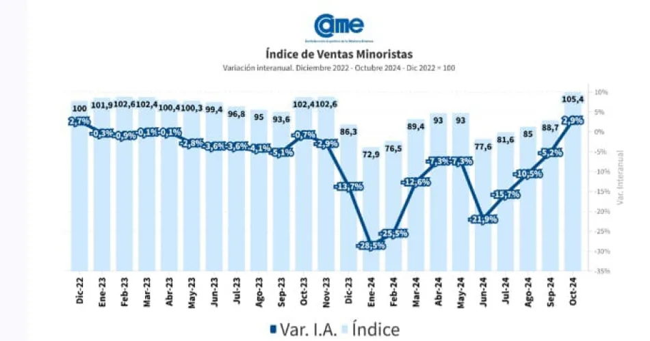 Así surge del Índice de Ventas Minoristas Pymes de la Confederación Argentina de la Mediana Empresa (CAME), elaborado en base a un relevamiento mensual entre 1.300 comercios minoristas del país, realizado del 1 y 2 de noviembre.