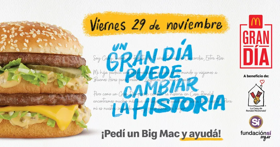 Se celebra hoy 29 de noviembre, en todos los locales de McDonald's del país. El 100% de lo recaudado por la venta del Big Mac será destinado a Casa Ronald y Fundación Sí, dos organizaciones que impactan en la educación y la salud de cientos de niños y jóvenes.