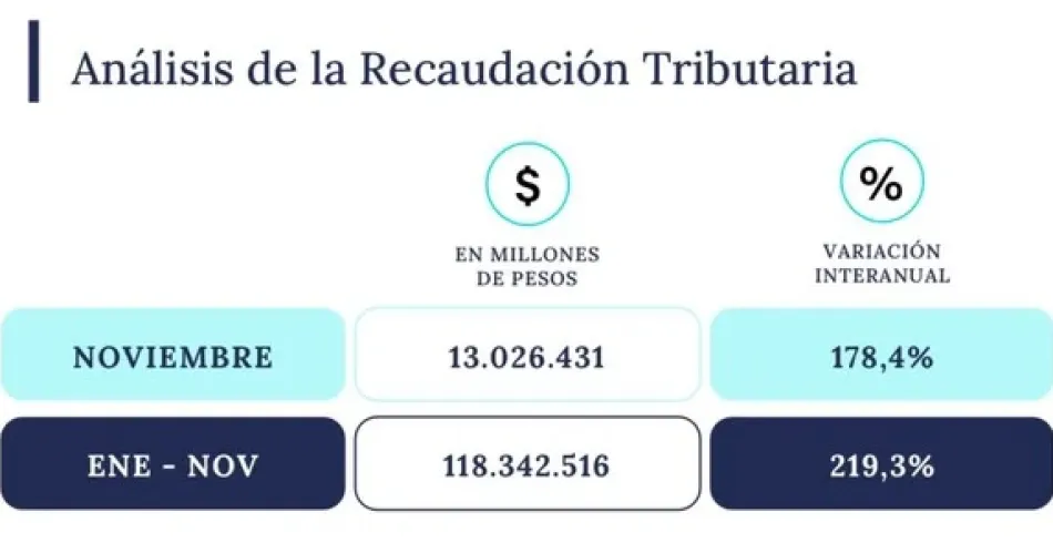 La recaudación de Recursos Tributarios alcanzó 13.026.431 millones de pesos en noviembre, con una variación interanual de 178,4%, informó la Agencia de Recaudación y Control Aduanero (ARCA).