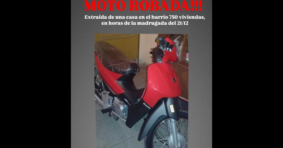En la madrugada del pasado 21 de diciembre, una motocicleta Zanella 120cc de color rojo fue sustraída de una vivienda ubicada en el barrio 750 Viviendas. Según la información brindada por la propietaria, Stella Yturres, el rodado posee características distintivas que podrían facilitar su identificación.